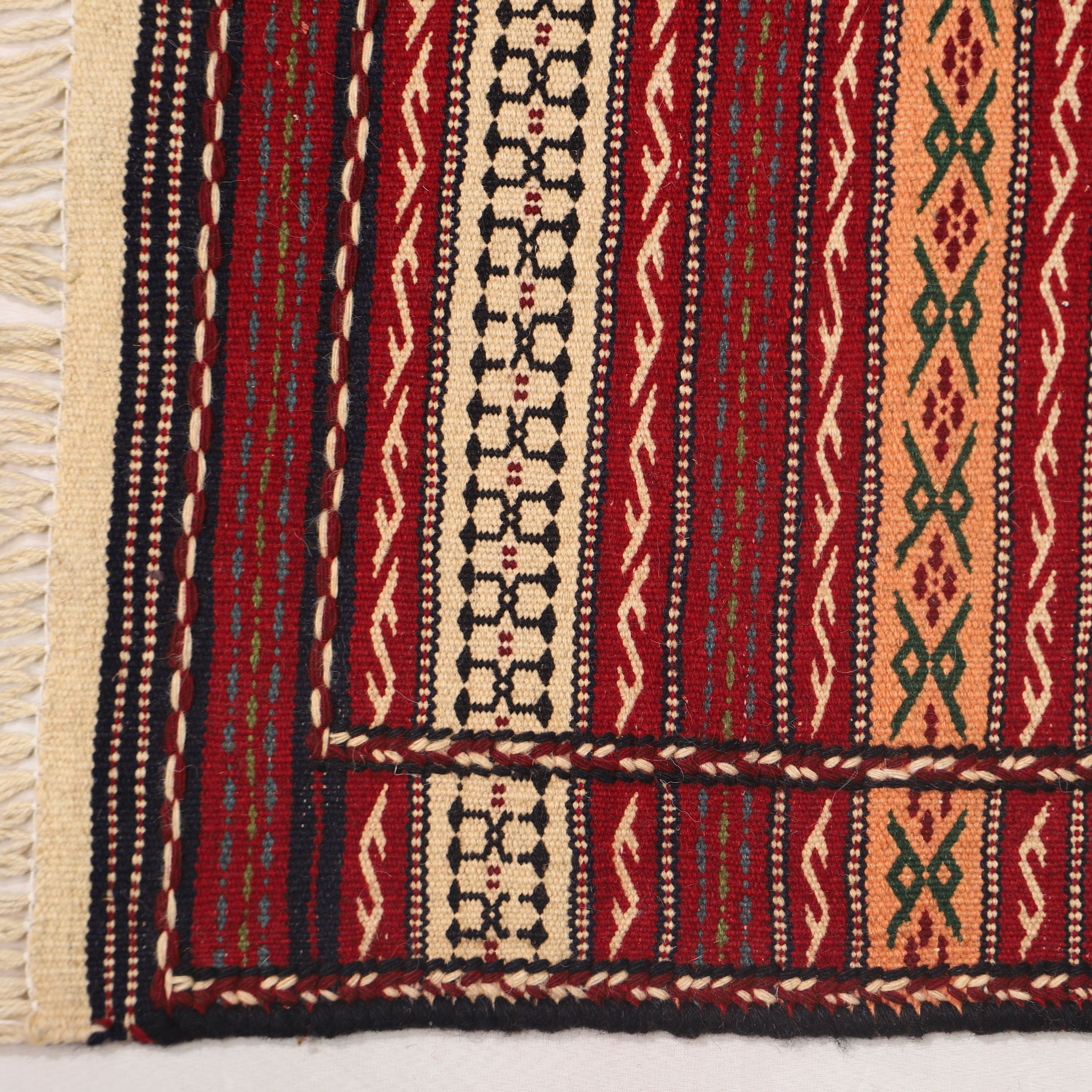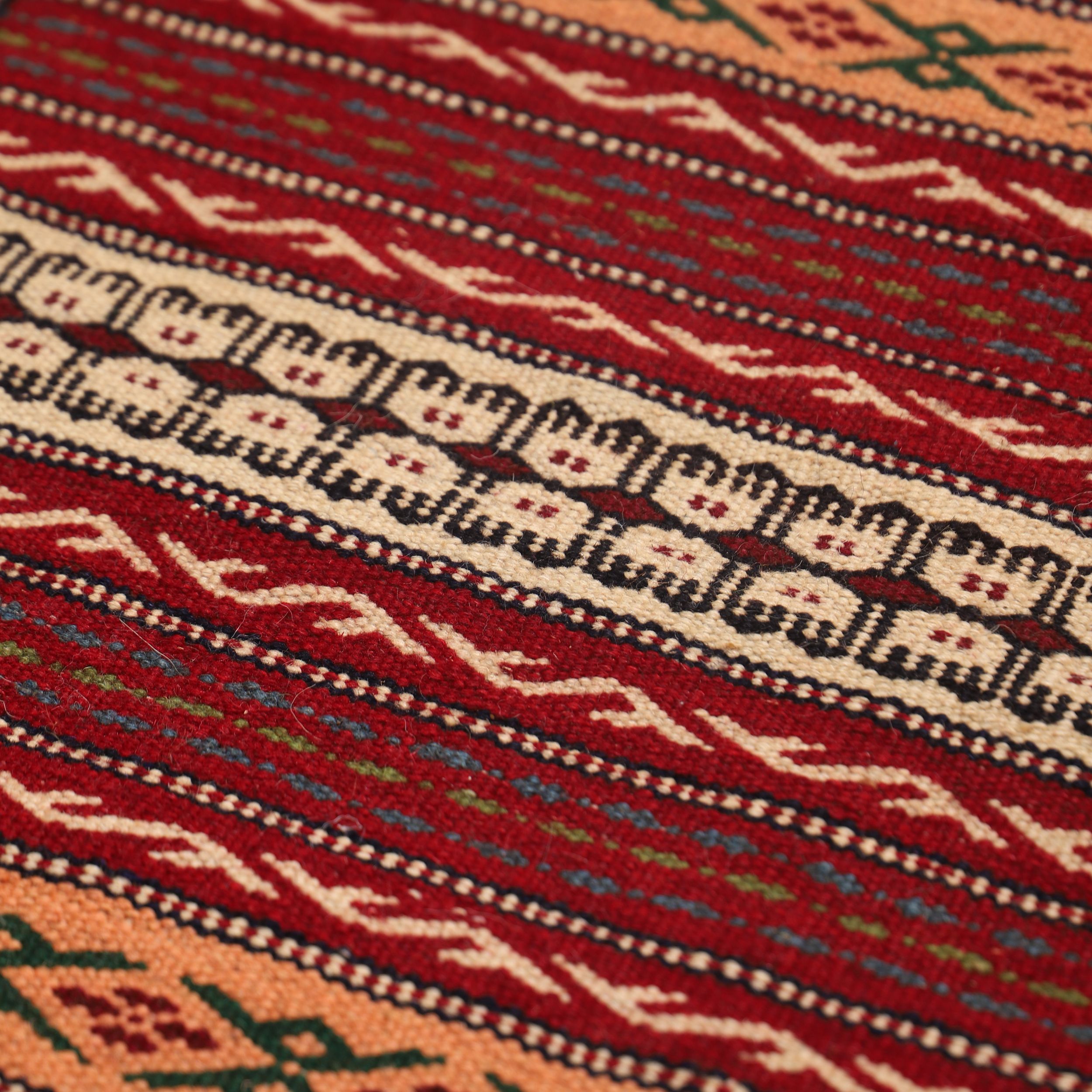 Although second-grade cotton fibers are sometimes used in palas weaving, the Kalat kilim is essentially a palas woven entirely from wool, making it an excellent insulator against heat and moisture. Most Kalat kilims are produced in the villages of Sirzar, Qaleh Zo, and Aghdash.
