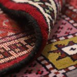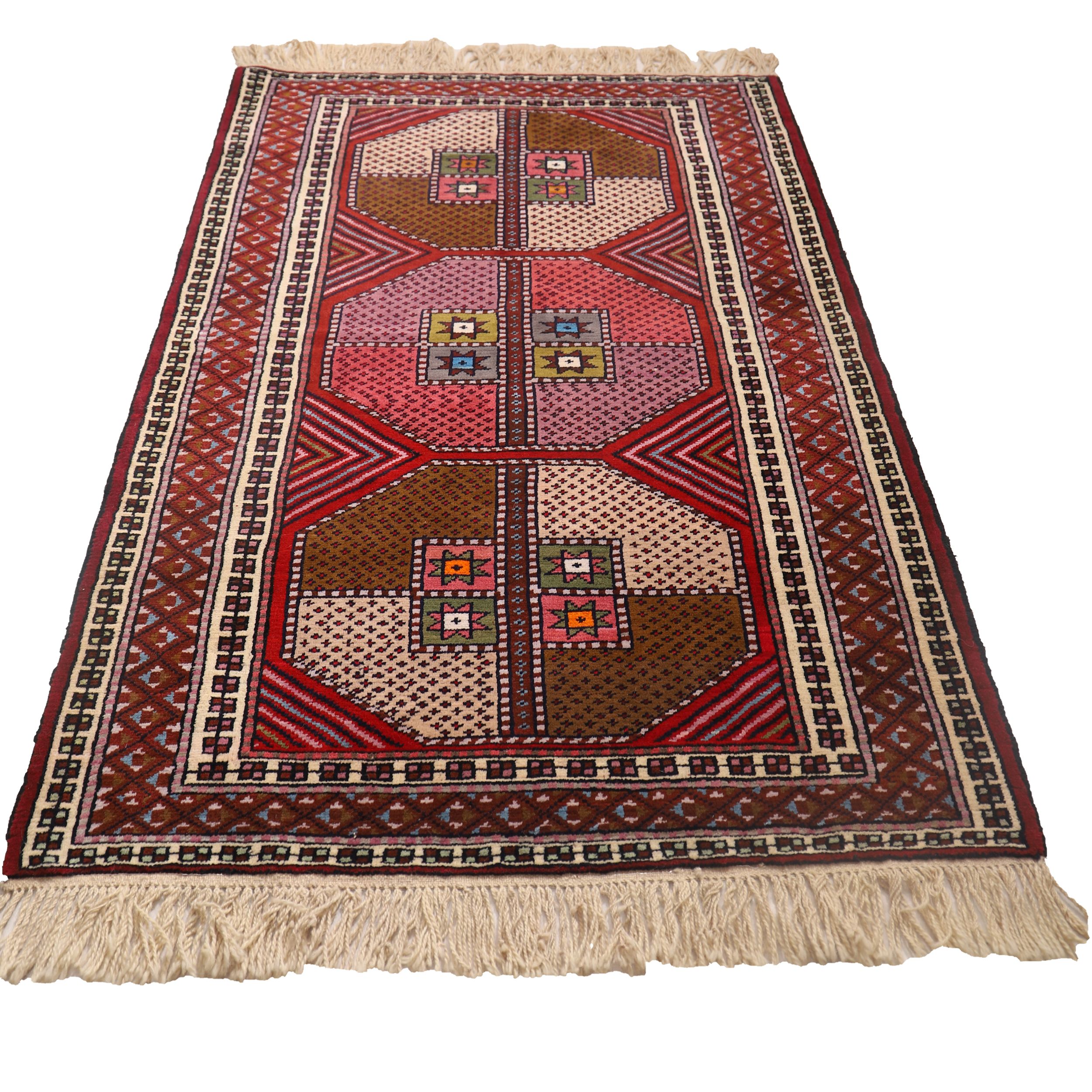 Kurdish weavers typically use the symmetric Kurdish knot on a wool warp, as seen in various Kurdish carpets such as the Bijar rug. The background of these carpets is often in brick-red or orange tones, adorned with motifs in blue, green, and ochre, which bring life to the traditional Kurdish symbols woven into the design.