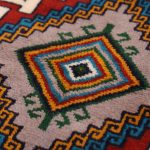Kurdish weavers typically use the symmetric Kurdish knot on a wool warp, as seen in various Kurdish carpets such as the Bijar rug. The background of these carpets is often in brick-red or orange tones, adorned with motifs in blue, green, and ochre, which bring life to the traditional Kurdish symbols woven into the design.