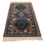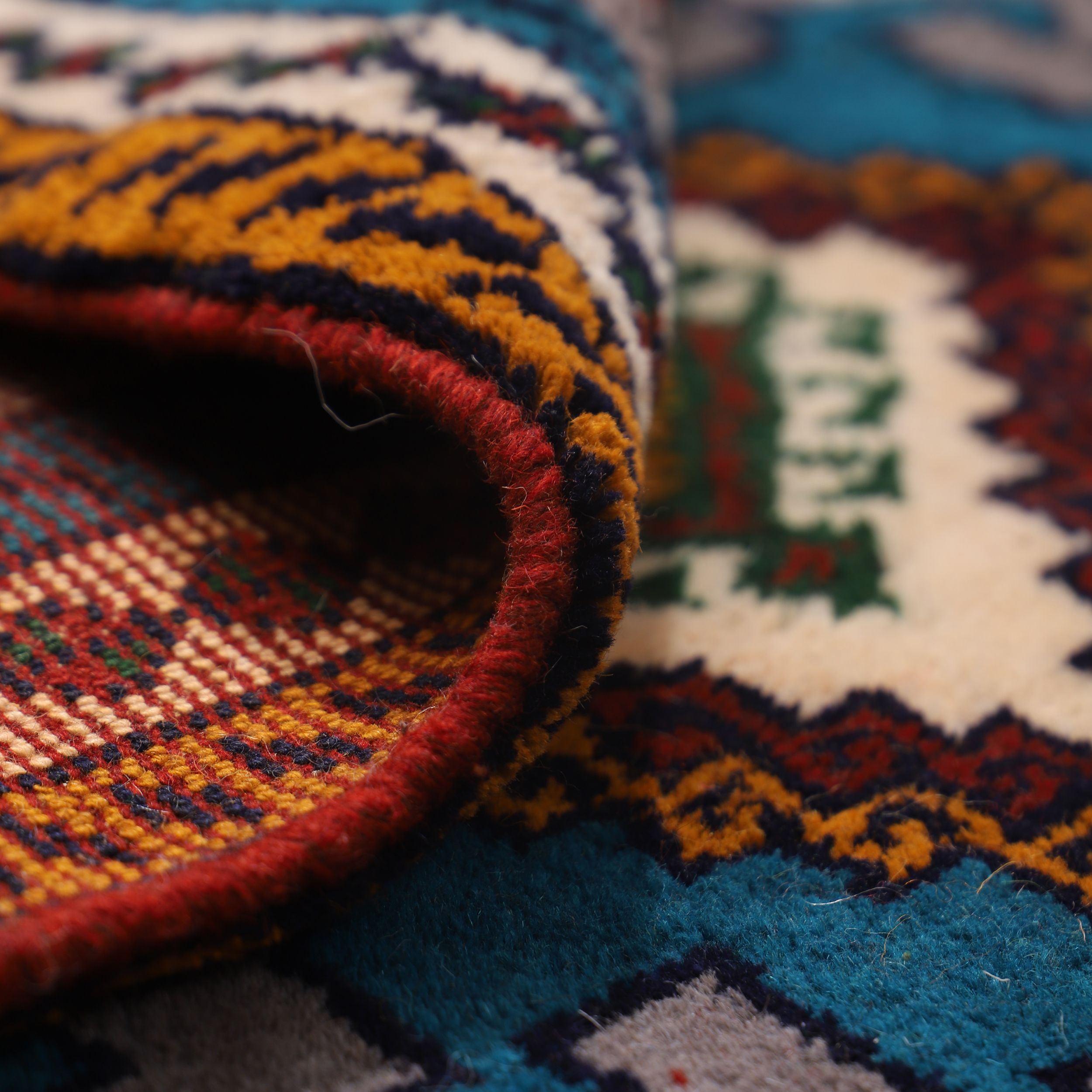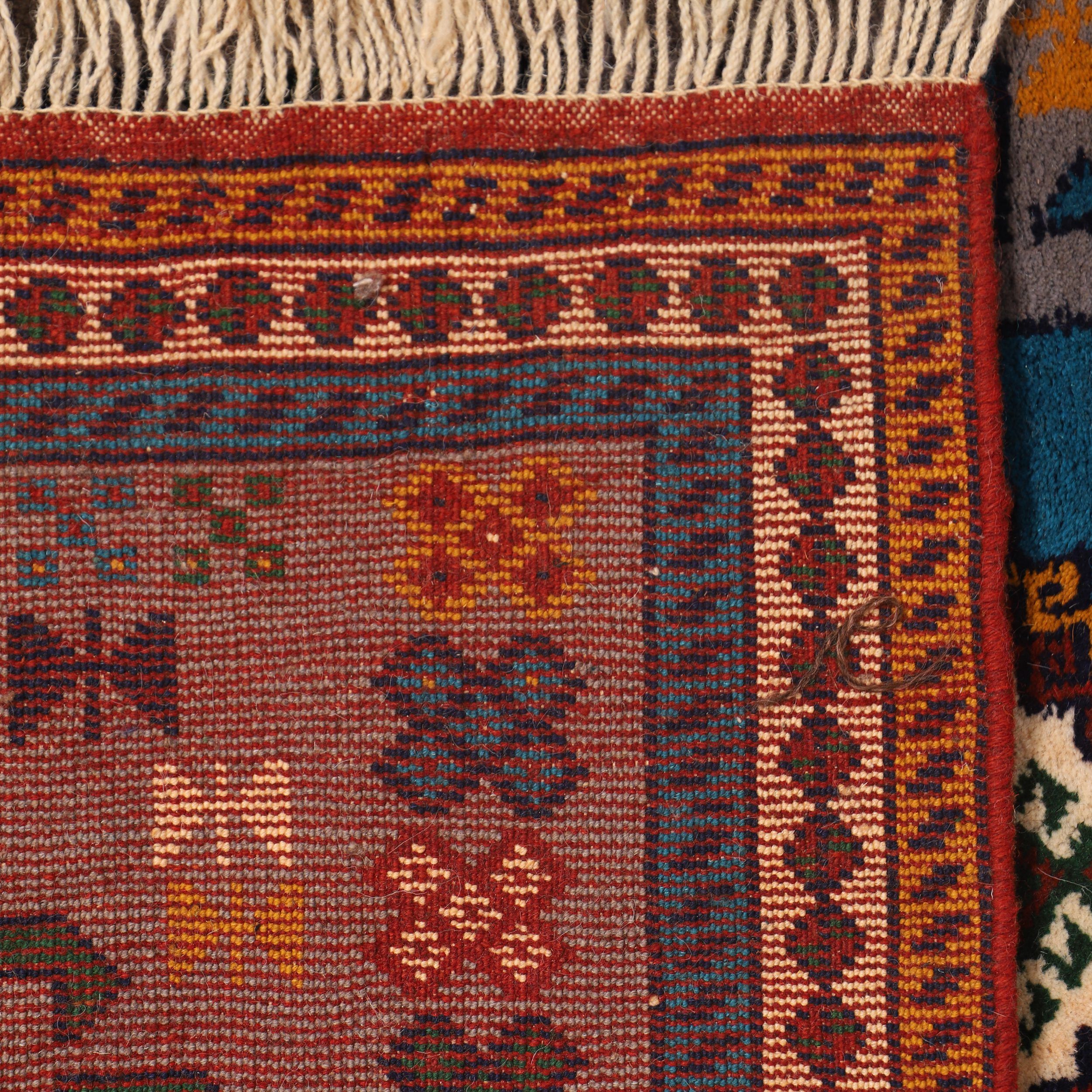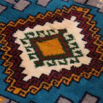 Kurdish weavers typically use the symmetric Kurdish knot on a wool warp, as seen in various Kurdish carpets such as the Bijar rug. The background of these carpets is often in brick-red or orange tones, adorned with motifs in blue, green, and ochre, which bring life to the traditional Kurdish symbols woven into the design.