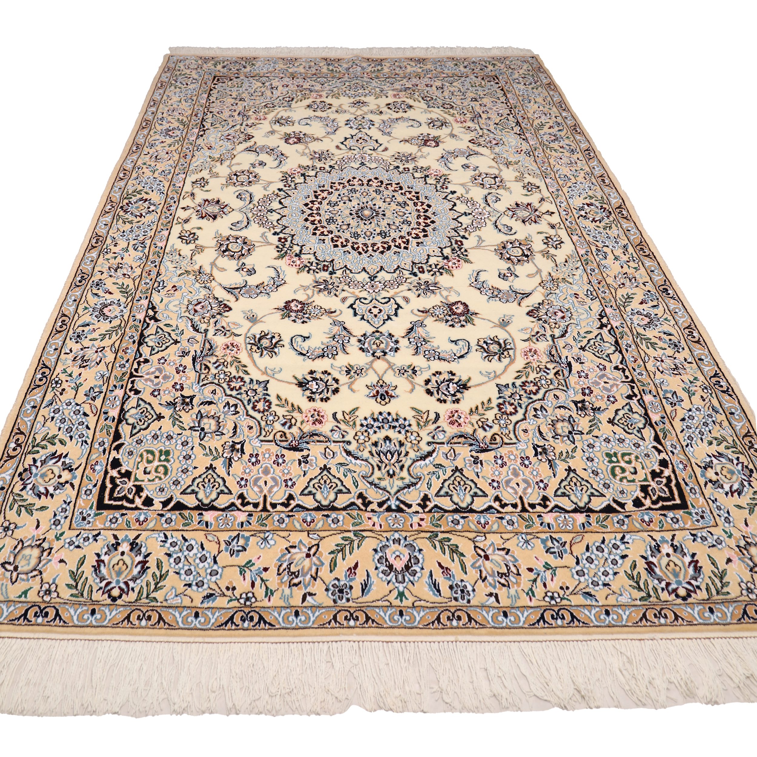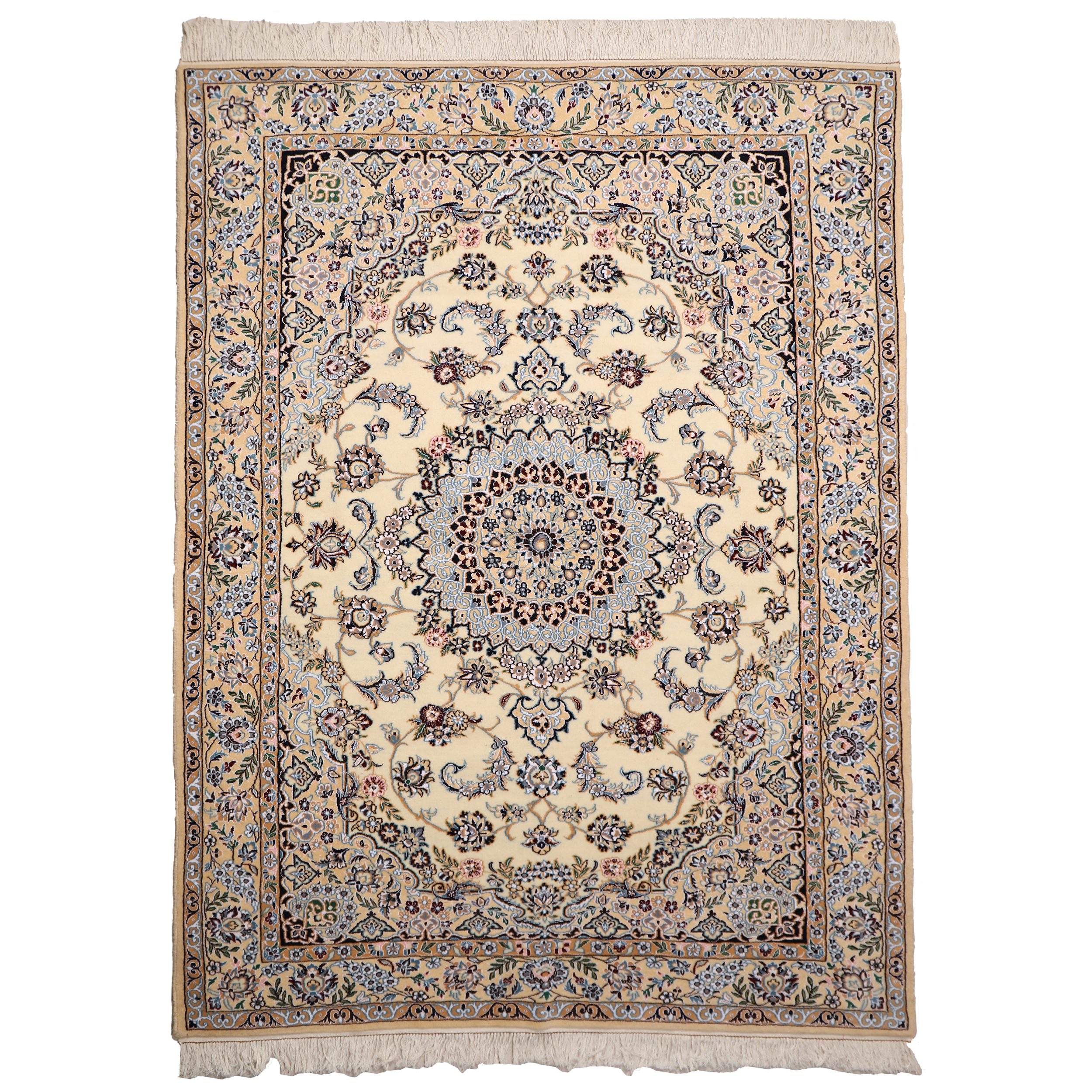The Nain carpet is a distinguished type of Iranian carpet and one of the traditional handicrafts of the Nain region, produced both historically and in contemporary times. It is renowned for its exceptional and refined color palette. The primary design elements of Nain carpets are highly delicate and elegant floral arabesque (Eslimi) motifs, which give these rugs their signature sophistication and grace.