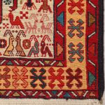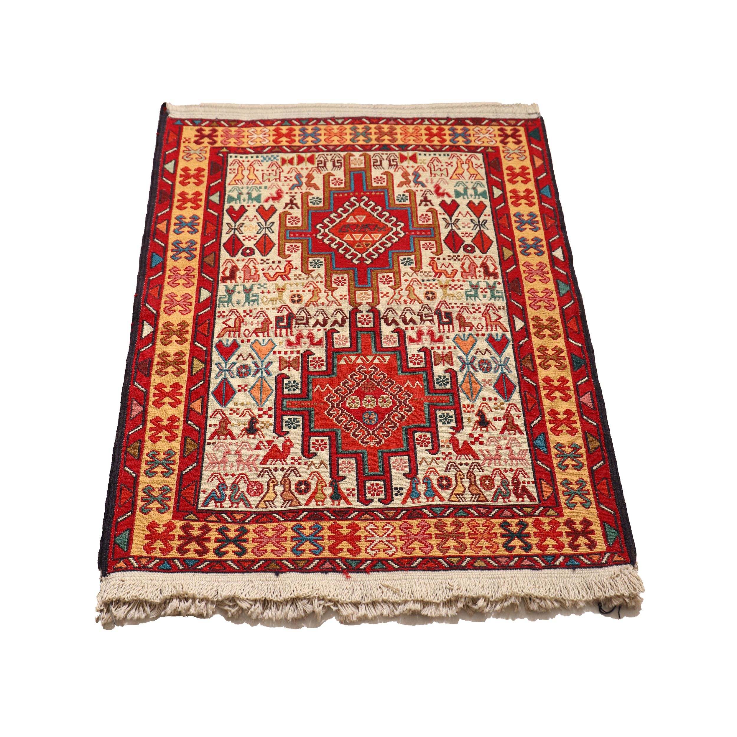 Verneh weavers beautifully incorporate geometric depictions of animals such as deer, gazelles, wolves, sheepdogs, turkeys, roosters, jackals, foxes, and various local birds, creating a striking and expressive visual language.