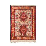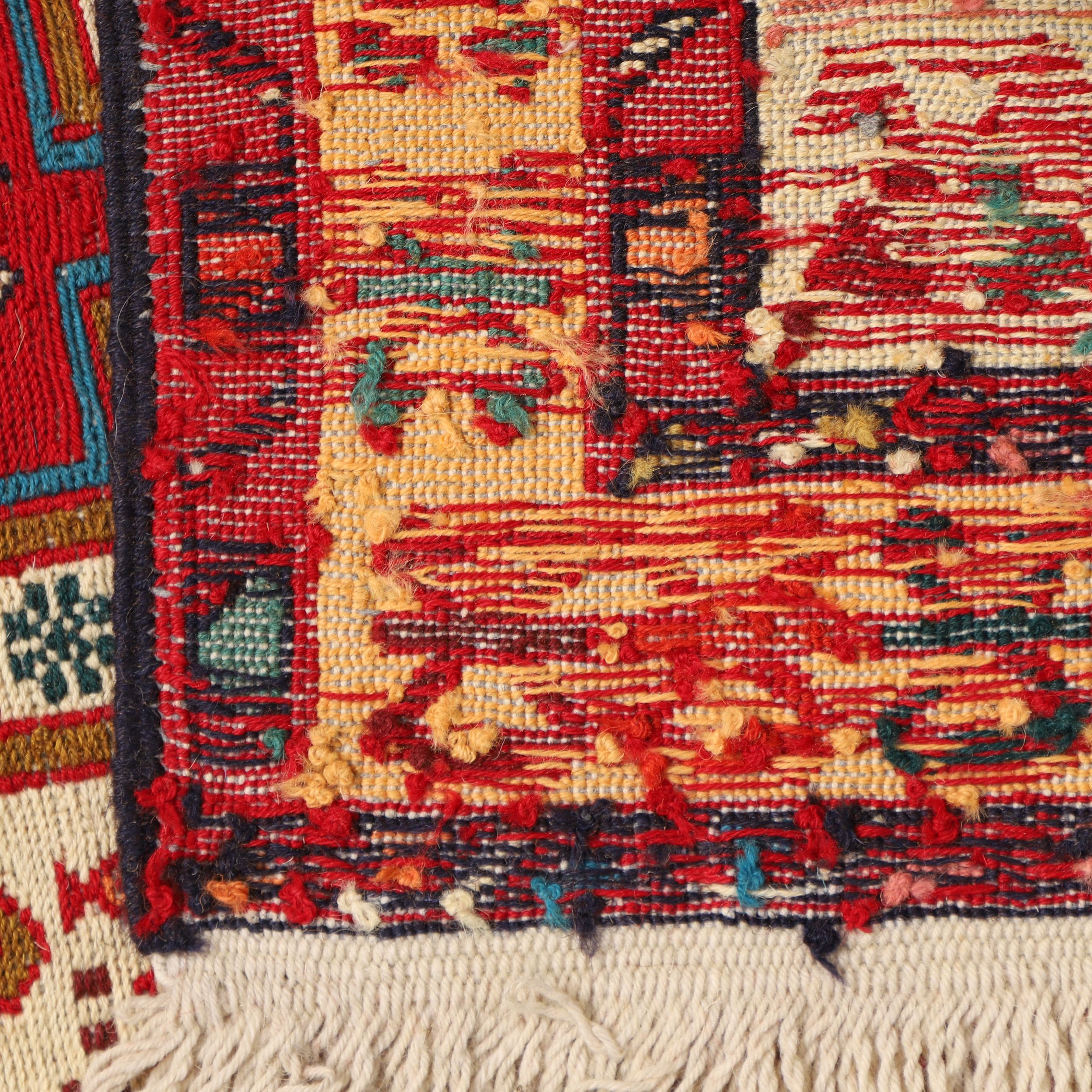 Verneh (also known as “Sileh Kilim” or “Soumak Kilim”) is a type of soumak weaving traditionally crafted without a pattern by the nomadic girls and women of the Arasbaran region. Verneh is essentially a pileless, single-sided kilim woven in the weft-wrapping technique, where the main weft passes through the warp threads while the colored wool yarns are wrapped around the warps to form the motifs.